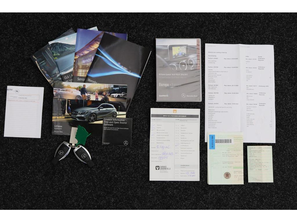 5-gear transmission (428), 7-speed automatic dual-clutch transmission (429), AMG FLOOR MATS (V43), AMG sport package (950), AMG styling package (front spoiler, slide skirts and rear apron) (772), ANDROID AUTO SMARTPHONE INTEGRATION (17U), APPLE CARPLAY SMARTPHONE INTEGRATION (16U), AUTOMATIC TRANSMISSION (GA), Adaptive brake lights (K11), Alternative refrigerant (2U8), Audio 20 radio navigation-capable NTG5 (522), Boekjes, COC DOCUMENT FOR EURO6 TECH. WITH REG. CERT. PART 2 (969), COLLISION WARNING SYSTEM WITH ACTIVE BRAKE APPLICATION FCW-STOP (258), COMMUNICATION MODULE (UMTS) FOR THE USE OF MERCEDES ME CONNECT SERVICES (360), CONTROL CODE FOR RASTATT/MERCOSUL PLANT (J31), CREWBUS (FS), Changeover of roof liner process at Rastatt plant (194), Conti tires for taxi (235), Control code for service interval 25000 km (K13), DISPLACEMENT 2.0 LITER (M20), DRIVE PROGRAM SELECTION SWITCH (AGILITY SELECT) (B59), EASY-PACK LIFTGATE (890U), ECO START/STOP FUNCTION (B03), ENGINE UPRATED (M014), Exhaust treatment, Euro 6 technology (927), FBS 4 (A17), FEDERAL REPUBLIC OF GERMANY (2XXL), Fabric/imitation leather/microfiber (650A), Fabric/imitation leather/microfiber - black/anthracite (651A), GARMIN® MAP PILOT (357), GERMANY (229L), GLEICHLAUFKOERPER sTRENGTHENS (28A), HEADLINER, BLACK FABRIC (51U), Headunit europe/CIS-states/Monoglei (3U1), ILLUMINATED DOOR SILL (U25), INLINE 4-CYLINDER SPARK IGNITION ENGINE M270 (M270), KEYLESS-START (893), KNEEBAG (294), LANGUAGE OF INSTRUMENT CLUSTER/HU - GERMAN (332B), LEFT-HAND STEERING (L), LEFT FRONT AXLE HALF (VL), Live Traffic capability (367), MB-Mobilo with DSB and GGD (255B), MB CONNECT - REMOTE ONLINE (HERMES) (11U), MODEL SERIES 176 (F176), NIGHT PACKAGE (P55), No code designations currently available (G011), OPERATOR'S MANUAL + SERVICE BOOKLET-GERMAN (02B), PANORAMIC SLIDING SUNROOF/GLASS ROOF (413), Pedestrian protection - Active hood (U60), Plant control code (JM6), RADIATOR GRILLE IN DIAMOND LOOK (5U4), REAR AXLE (HA), REFRIGERANT COMPRESSOR WITH MAGNETIC CLUTCH (B09), RIGHT FRONT AXLE HALF (VR), Rear belt status indicator (U01), SAFETY VEST - DRIVER (70B), SALES CONTROL CODE FOR CODE 475 REQUEST (6P5), SMARTPHONE INTEGRATION (14U), SPEED/LOAD INDEX 91Y XL (V94), SPORT EDITION (P84), SUMMER TYRES (R01), Seat Comfort package (U59), Single CD drive (818), Software control for unpowered in position D (K27), THEN (FW), TIRE PRESSURE MONITOR (TPM) (475), VEHICLES WITH 4MATIC/ALL-WHEEL DRIVE (M005), Voltage dip protector for start/stop system (4U7), Windowbags (290), airbag in steering wheel (442), air conditioner (580), automatic antenna and front loudspeaker – without radio set (538), auto pilot system (351), change of model year, the last figure shows the new model year (808), code 481 and 485 (486), code 630 and 634 (632), cruise control (cruise control) (440), cupholder (309), elimination of type sign on trunk lid (260), glass shaded (840), heat-insulating glass all around, band filter grey, rear window pane single-sheet safety glass (693), light and sight package (U62), rain sensor for windshield wipers (345), reading lamp in the rear (877), seat heater (873), steering wheel and gearshift lever in leather trim (280), sun visor with vanity mirror, illuminated (543), wheel cover for AMG wheels (776)