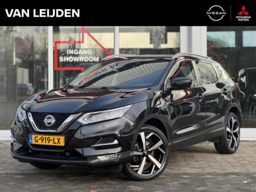 2 bekerhouders achter, 2 bekerhouders voor, 3-punts veiligheidsgordels achter, 3-punts veiligheidsgordels voor, 5'' Kleuren TFT instrumentenpaneel, 12V aansluiting, 19'' lichtmetalen velgen, ABS (Anti-blokkeersysteem), Achterbankleuning in delen neerklapbaar (60/40), Actieve hoofdsteunen voor, Android Auto, Apple Car Play, Audiosysteem met CD-speler, USB-aansluiting, stuurwielbediening en 6 luidsprekers, Autohold functie, Automatisch dimmende binnenspiegel, Automatisch in-/uitschakelende koplampen, Automatisch inklapbare buitenspiegels, Bandenspanningscontrolesysteem, Bi LED koplampen, Bluetooth, Buitenspiegelkappen in carrosseriekleur, Centrale deurvergrendeling met afstandsbediening, Chassis Control Systeem (Active Trace Control, Active Ride Control, Xtronic Active Engine Brake), Chromen raam omlijsting, Cruise control en speedlimiter met stuurwielbediening, Detectie van bewegende objecten, Digital audio broadcasting (DAB+), Dynamische bochtenverlichting, EBD (elektronische remkrachtverdeler), ESP (Electronic Stability Program), Elektrisch bedienbare ramen voor en achter met sneltoetsen, Elektrisch verstelbare bestuurdersstoel, Elektrisch verstelbare en verwarmbare buitenspiegels, Elektronische parkeerrem, Elektronische stuurbekrachtiging, Extra getint glas (achterste zijramen en achterruit), Flexibele bagageruimte indeling, Gescheiden automatische airconditioning (2 zones), Gordijn airbags, Haaienvin-antenne, Half lederen bekleding, Hoofdsteunen achter, ISOFIX-bevestigingspunten achter (2), In hoogte en diepte verstelbaar stuurwiel, In hoogte verstelbare bestuurdersstoel, In hoogte verstelbare passagiersstoel, Intelligent Key met startknop, Intelligente parkeerassistent, Interieur ambiance verlichting, LED dagrijverlichting met geïntegreerde knipperlichten, LED verlichting achter, Lederen stuurwiel en versnellingspookknop, Lendensteunverstelling voorstoelen, Metallic lak, Middenarmsteun achter, Middenarmsteun voor, Mistlampen voor, NBAS (Nissan Brake Assist), Nissan Around View Monitor, NissanConnect navigatie, Nissan Safety Shield Plus, Nissan safety shield, Panoramisch glazen dak, Parkeersensoren (voor/achter), Portiergrepen in carrosseriekleur, Regensensor, Reparatiekit voor de banden, Startonderbreking, Uitschakelbare passagiersairbag, Verwarmbare voorstoelen, Verwarmde voorruit, Voor- en zijairbags, Voorstoelen met sportdesign en geïntegreerde hoofdsteunen, Zilverkleurige dakrails, Zilverkleurige stylingplaten achterbumper, Zonnekleppen met verlichte make-up spiegel