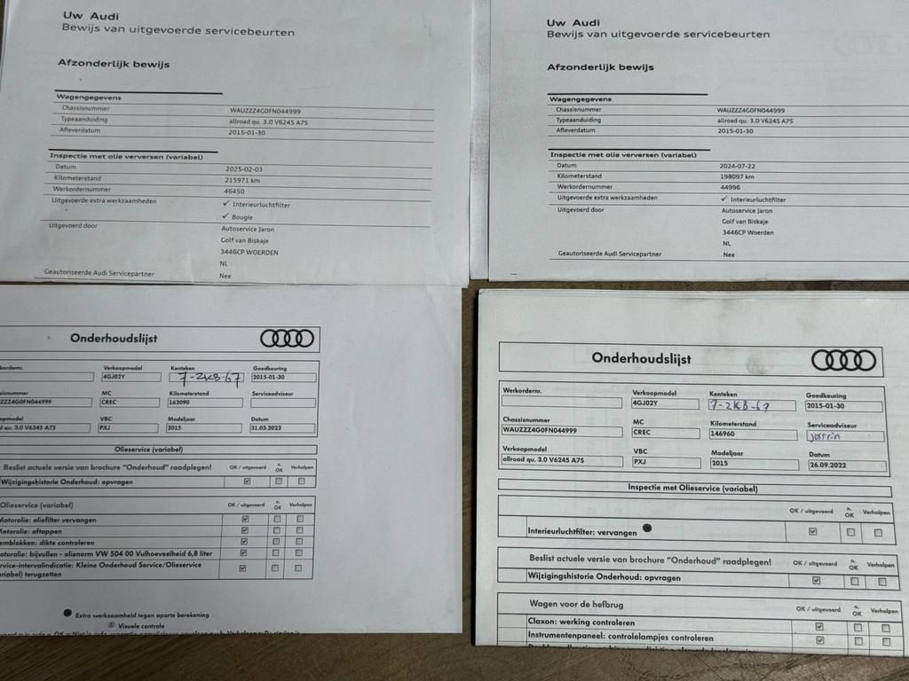 "Lichtmetalen velgen 18""", "Lichtmetalen velgen 20""", 4x4, 360 Camera, APK, Achterbank in delen neerklapbaar, Achteruitrijcamera, Airbag(s) hoofd achter, Airbag(s) hoofd voor, Airbag(s) side achter, Airbag(s) side voor, Airbag bestuurder, Airbag passagier, Airco separaat achter, Aluminium interieur afwerking, Anti Blokkeer Systeem, Anti Blokkeer Systeem (ABS), Anti Slip Control, Anti doorSlip Regeling, Armsteun achter, Armsteun voor, Assistentie Pakket, Audi Assist, Audi Comfort, Audi Sound, Audio-navigatie full map, Audio installatie premium, Automatisch Sper Differentieel, Autotelefoonvoorbereiding met Bluetooth, Bagage-scheidingsnet, Bandenspanningscontrolesysteem, Bi-xenon koplampen, Binnenspiegel automatisch dimmend, Bluetooth telefoonvoorbereiding, Boordcomputer, Buitenspiegel elektrisch inklapbaar en automatisch dimmend, Buitenspiegels elektrisch inklapbaar, Buitenspiegels elektrisch met geheugen, Buitenspiegels elektrisch verstelbaar, Buitenspiegels verwarmbaar, Centrale deurvergrendeling met afstandsbediening, Comfortstoel(en), Cruise control, Cruise control adaptief met Stop&Go, DAB-ontvanger, Dakrails, Dimlichten automatisch, Dodehoek detector, Elecktrische achterklep, Elecktrisch uitklapbare trekhaak, Electronic Stability Program, Electronic Stability Program (ESP), Electronic climate controle, Elektrisch bedienbare achterklep, Elektrische ramen voor, Elektrisch verstelbare stoel(en) met geheugen, Elektronisch Sper Differentieel, Elektronisch Stabiliteits Programma, Elektronische remkrachtverdeling, Elektronisch sperdifferentieel, Extra getint glas, Hard disk, Head-up display, Head up display, Houten versnellingspook, Interieurvoorverwarming, Interieur voorverwarmingsinstallatie, Keyless entry, LED Matrix, LED achterlichten, LED dagrijverlichting, Lane assist, Lederen bekleding, Lederen stuurwiel, Lendensteun verstelbaar, Lendesteunen (verstelbaar), Luchtvering, Luxe lederen bekleding, Matrix LED koplampen, Metallic lak, Multimedia-voorbereiding, Nachtzicht-assistent, Niveauregeling automatisch, Parkeer-assistent, Parkeersensor voor en achter, Premium kleur, Regensensor, Rijstrooksensor, Rondomzicht camera, Schakelmogelijkheid aan stuurwiel, Side Assist, Side Impact Protection System, Speciale kleur, Start/stop systeem, Startblokkering, Stoel ventilatie voor, Stuur verstelbaar, Stuurwiel multifunctioneel, Tractie Controle Systeem (TCS), Trekhaak uitklapbaar, Variabele stuuroverbrenging, Verkeersbord detectie, Voorstoelen verwarmd, achterbank in delen neerklapbaar, adaptief demping systeem, adaptive cruise control, afst. bed. voor centr. deurvergr., airco met automatische regeling, aluminium interieur afwerking, antenne, audio-navigatiesysteem, automatisch dimmende binnenspiegel, autotelefoon voorbereiding, bandenspanningscontrolesysteem, bestuurders-informatie-systeem, bestuurdersairbag, bestuurdersstoel in hoogte verstelbaar, binnen/buitensp. aut. dimmend, buitensp.elektr.verstel-verwarmb.+inklapbaar, buitenspiegels elektr. met geheugen, buitenspiegels elektrisch inklapbaar, buitenspiegels elektrisch verstelbaar, buitenspiegels in carrosseriekleur, buitenspiegels van binnenuit verstelbaar, bumpers en spiegels in car.kleur, centrale deurvergrendeling met afstandsbediening, comfort stoelen, cruise control, dakrails, elektrische ramen achter, elektrisch verstelb. bestuurdersstoel met geheugen, elektrisch verstelbare stoel(en) met geheugen, elektrisch verstelbare voorstoel(en), geventileerde voorstoelen, grootlichtassistent, hill hold functie, hoofd airbag(s) achter, hoofd airbag(s) voor, hoofdsteunen actief, hoofdsteunen voor en achter, incl boekjes, isofix, keyless entry, keyless go, koplampreiniging, lederen stuurwiel en versnellingspook, luchtvering, metaalkleur, multifunctioneel lederen stuurwiel, multimedia-voorbereiding, nationale autopas, navigatiesysteem full map + hard disk, onderhoudsboekjes aanwezig, parkeersensor voor en achter, passagiersairbag, passagiersstoel in hoogte verstelbaar, radio-CD/MP3 speler, spraakbediening, standkachel, start/stop systeem, stuur verstelbaar, stuurwiel multifunctioneel, technisch zeer goede auto, trekhaak, variable interval ruitenwisser, vermoeidheids herkenning, verstelbare stuurkolom, vierwielaandrijving (4x4), voorstoelen in hoogte verstelbaar, voorstoelen verwarmd, zeer mooie en complete limousine, zeer mooie en technisch goed onderhouden auto, zeer nette auto, zij airbag(s) achter, zij airbag(s) voor