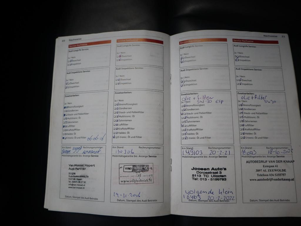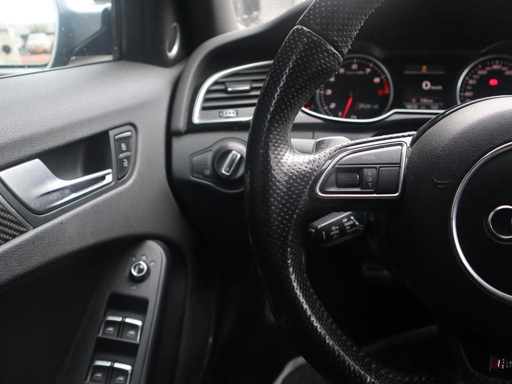 Adaptive light (8Q5), Airconditioning, volautomatisch comfort 3-zone (9AQ), Anti Blokkeer Systeem, Anti doorSlip Regeling, Audi dynamic steering (1N8), Audi music interface (UF7), Bandenspanningcontrolesysteem (7K6), Bang & Olufsen soundsystem (9VK), Bekleding, leder "Fijnnappa" met bies in rotsgrijs (N5V), Binnenspiegel, automatisch dimmend (4L6), Buitenspiegels, elektrisch inklapbaar en automatisch dimmend (6XK), Dakreling, zwart (3S2), Elektronisch Stabiliteits Programma, Inleg, carbon Atlas (5MK), Lendensteunen vóór, elektrisch verstelbaar (7P1), MMI navigatie plus (PNQ), Middenarmsteun voor A4 (6E3), Parkeerhulp achter (7X1), Parkeerhulp plus (7X4), RDW-leges, S Line exterieur, Sportdifferentieel (GH2), Sportonderstel (1BE), Sportstoelen voor A4 (PS1), Stoelen vóór, elektrisch verstelbaar (PV1), Telefoonvoorbereiding basis (9ZX), Wegrijassistent (UH2), Xenon plus verlichting (PX1), Zij-airbags achter (4X4), achterbank neerklapbaar, airco (automatisch), alarm klasse 1(startblokkering), aluminium interieur afwerking, armsteun achter, bagage-scheidingsnet, bestuurdersairbag, boordcomputer, centrale deurvergrendeling met afstandsbediening, cruise control, dakspoiler, dimlichten automatisch, elektrische ramen voor en achter, elektronische remkrachtverdeling, koplampreiniging, lederen stuurwiel, lichtmetalen velgen 19", metaalkleur, mistlampen voor, passagiersairbag, radio CD speler, regensensor, ruitensproeiers verwarmbaar, start/stop systeem, stuurwiel multifunctioneel, vermoeidheids herkenning, zij airbag(s) voor