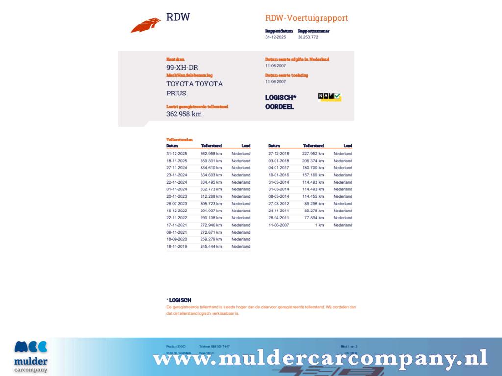 Bijzonderheden: Goed rijdende origineel Nederlands geleverde Prius. Altijd Toyota dealer onderhouden en staat op 4 seizoenen banden. Heeft een trekhaak. Heeft wel de nodige beschadigingen aan de buitenzijde. Katalysator heeft diefstal preventie. Zuinig in gebruik, zuinig in onderhoud. En maximaal betrouwbaar. 'Let's go places', ook met deze Toyota. De aandrijving van deze Toyota wordt verzorgd door een viercilinder motor en een automatische transmissie. Altijd al een voorkeur voor een lederen interieur gehad? Deze Toyota Prius heeft het! Verder is de Toyota uitgerust met: 16 inch lichtmetalen velgen, warmtewerend glas, in delen neerklapbare achterbank, elektrisch bedienbare en verwarmde buitenspiegels, elektrisch bedienbare ramen voor en metallic lak. Het spreekt voor zich dat een auto als deze ook van electronic climate control is voorzien. Een stabiele en comfortabele snelheid houdt u feilloos aan met de cruise control. Wat u ook in deze auto kunt vinden zijn lederen stuur en centrale deurvergrendeling met afstandsbediening. In de Toyota Prius heeft uw veiligheid en die van uw omgeving prioriteit. Wanneer u hard moet remmen, is elke decimeter verkorting van de remweg essentieel. Voor extra remkracht zorgt dan de Brake Assist. We kunnen ons voorstellen dat u een proefrit wilt maken met deze Toyota. Belt u ons snel? Bedrijfsinformatie: Alle prijzen zijn zo NETTO meeneem prijzen tenzij ander vermeld. DUS GEEN RIJKLAARMAAK KOSTEN! Wilt u dat ik de auto voor u bij aflevering een onderhoudsbeurt laat geven en/of wilt u aanvullende garantie op een auto, kan ik dit voor u tegen meerprijs regelen. De kosten van onderhoudsbeurt zijn € 275,-. Ook kunnen wij u zes maanden aanvullende beperkte garantie (mits de betreffende auto aan de daarvoor door Autotrust gestelde voorwaarden voldoet), kosten hiervan zijn € 275,-. Wij stellen zelf het kenteken op uw naam u krijgt bij de auto een Nationale Auto Pas. U bent altijd van harte welkom om bij de auto te komen kijken en er mee proef te rijden, 7 dagen per week en ook buiten openingstijden, 24/7. Ik zet een vers kopje koffie of thee voor je. Wel even bellen, ik ben niet altijd aanwezig. Alle inruil is mogelijk. Ik ben open op afspraak, het adres is Kampenringweg 7, 2803 PE Gouda. Voor meer foto's kijk op www.muldercarcompany.nl. Ik ben gespecialiseerd in kleine automaten en heb er altijd een aantal op voorraad. Specificaties worden zo nauwkeurig mogelijk ingevoerd. Voor fouten bieden wij onze excuses aan, maar er kunnen geen rechten aan worden ontleend. BTW nummer: NL001964694B54. KvK nummer : 55411045. IBAN: NL39 RABO 0393 0865 18. RDW nr.: 55882