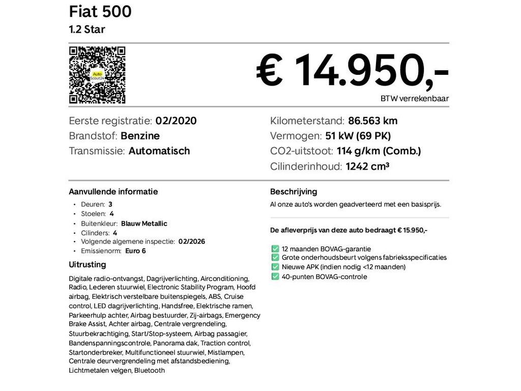 "Lichtmetalen velgen 15""", Achterbank in delen neerklapbaar, Achteropkomend verkeer waarschuwing, Airbag(s) hoofd achter, Airbag(s) hoofd voor, Airbag(s) knie, Airbag(s) side voor, Airbag bestuurder, Airbag passagier, Airco, Anti Blokkeer Systeem (ABS), Autotelefoonvoorbereiding met Bluetooth, Bandenspanningscontrolesysteem, Bestuurdersstoel in hoogte verstelbaar, Brake Assist System, Buitenspiegels elektrisch verstelbaar, Buitenspiegels in carrosseriekleur, Buitenspiegels verwarmbaar, Centrale deurvergrendeling met afstandsbediening, Chroom delen exterieur, Cruise control, DAB-ontvanger, Electronic Brake Distribution (EBD), Electronic Stability Program (ESP), Elektrische ramen voor, Hoofdsteunen achter, LED dagrijverlichting, Lederen stuurwiel, Mistlampen voor, Panoramadak, Parkeersensor achter, Radio, Start/stop systeem, Startblokkering, Stuurbekrachtiging snelheidsafhankelijk, Stuur verstelbaar, Stuurwiel multifunctioneel, Telefoonintegratie premium, Tractie Controle Systeem (TCS)