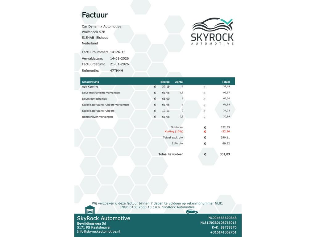 Airbag(s) hoofd achter, Airbag(s) hoofd voor, Airbag(s) side voor, Airbag bestuurder, Airbag passagier, Airco automatisch, Anti Blokkeer Systeem (ABS), Armsteun voor, Audio installatie, Boordcomputer, Buitenspiegels elektrisch verstelbaar, Buitenspiegels in carrosseriekleur, Buitenspiegels verwarmbaar, Bumpers in carrosseriekleur, Centrale deurvergrendeling met afstandsbediening, Dakrails, Electronic Brake Distribution (EBD), Elektrische ramen voor, Lederen stuurwiel, Lederen versnellingspook, Lendesteunen (verstelbaar), Metallic lak, Startblokkering, Stuur verstelbaar, Stuurwiel multifunctioneel, Trekhaak