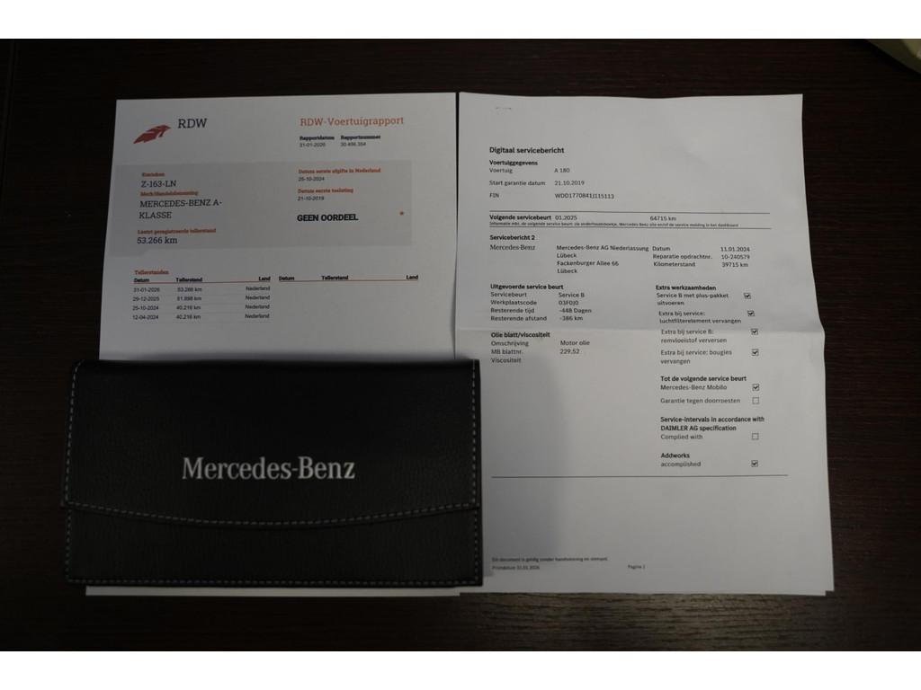 "Lichtmetalen velgen 18""", AMG-styling, Accident Avoidance System, Achterbank in delen neerklapbaar, Achteruitrijcamera, Airbag(s) hoofd achter, Airbag(s) hoofd voor, Airbag(s) knie, Airbag(s) side voor, Airbag bestuurder, Airbag passagier, Airco automatisch, Anti Blokkeer Systeem (ABS), Armsteun voor, Autotelefoonvoorbereiding met Bluetooth, Bandenspanningscontrolesysteem, Bestuurdersstoel in hoogte verstelbaar, Binnenspiegel automatisch dimmend, Brake Assist System, Buitenspiegel(s) automatisch dimmend, Buitenspiegels elektrisch inklapbaar, Chroom delen exterieur, Comfortstoel(en), Connected services, Cruise control, Dimlichten automatisch, Keyless start, Kunstlederen bekleding, LED achterlichten, LED dagrijverlichting, LED koplampen, Lederen stuurwiel, Lendesteunen (verstelbaar), Metallic lak, Multimedia-voorbereiding, Navigatie-systeem full map + hard disk, Parkeer-assistent, Parkeersensor achter, Parkeersensor voor, Radio, Regensensor, Rijstrooksensor met correctie, Side skirts, Signaalkleur, Sportstoelen, Sportstuur, Spraakbediening, Start/stop systeem, Startblokkering, Stuurwiel multifunctioneel, Telefoonintegratie premium, Variabele stuuroverbrenging, Verkeersbord detectie, Verwarmde voorstoelen, Volledig digitaal instrumentenpaneel, WiFi voorbereiding