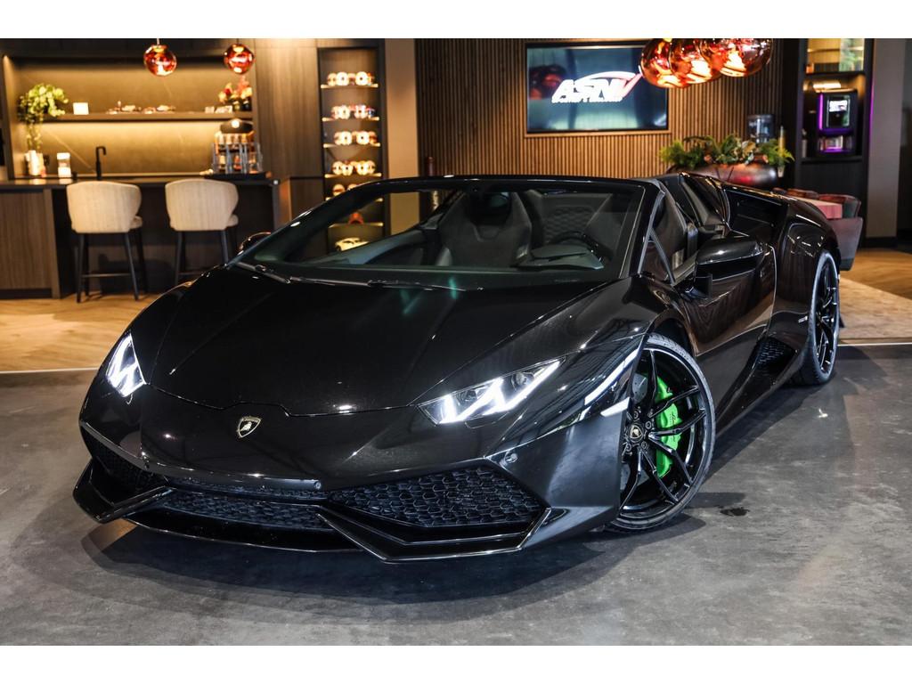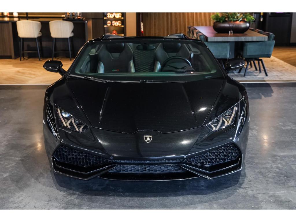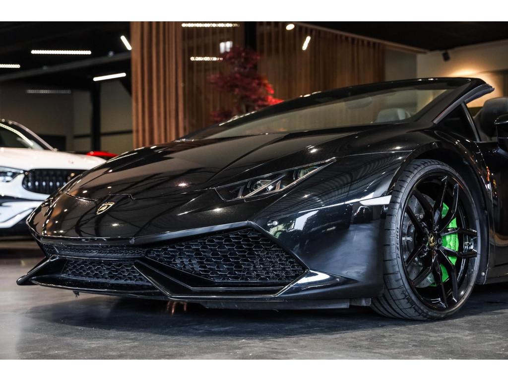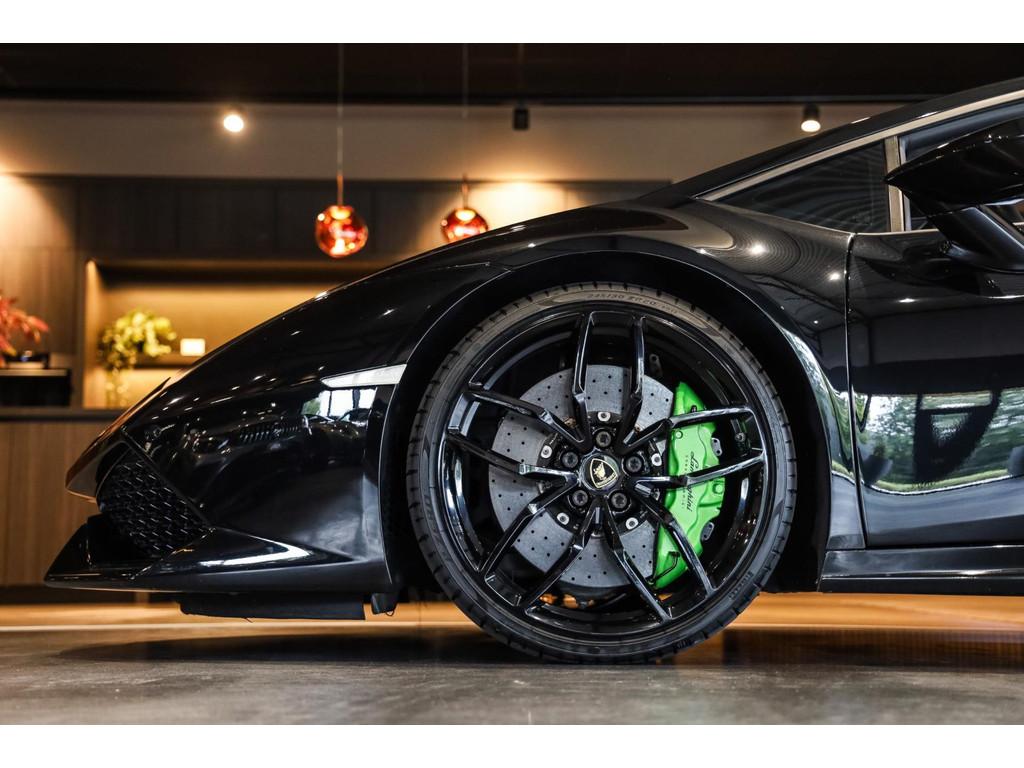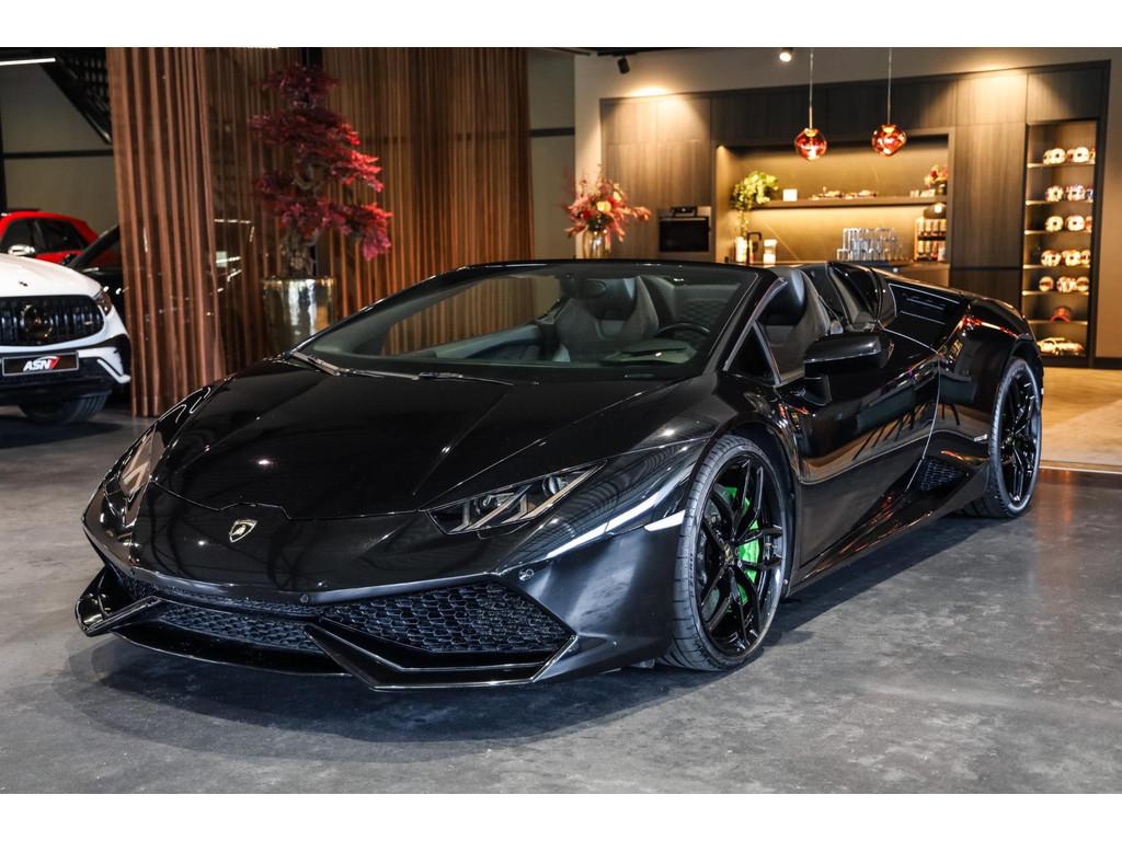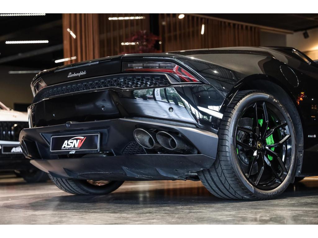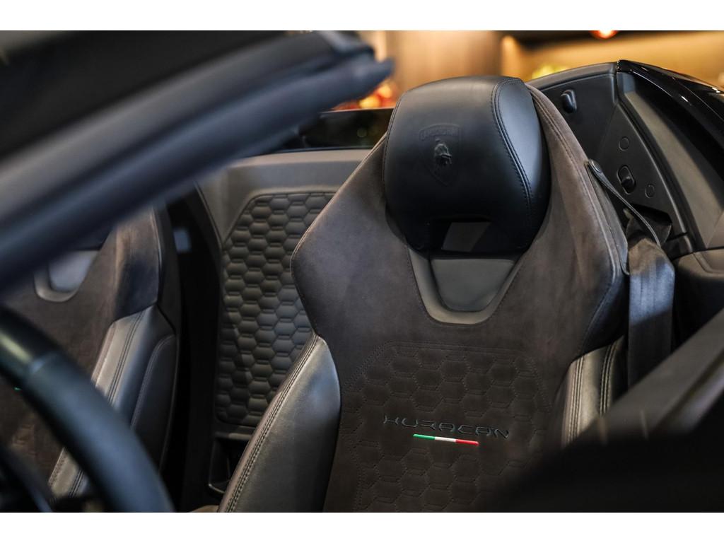 "Lichtmetalen velgen 20""", Adaptief Demping Systeem (ADS), Airbag(s) knie, Airbag(s) side voor, Airbag bestuurder, Airbag passagier, Alcantara bekleding, Aluminium sportpedalen en Schakelflippers, Anti Blokkeer Systeem (ABS), Audio installatie premium, Automatische koplampactivering / Lichtsensor, Autotelefoonvoorbereiding met Bluetooth, Bekerhouders, Bestuurdersinformatiesysteem, Comfort middenarmsteun met opbergmogelijkheid, Contrast Stitching, Electronic Stability Program (ESP), Elektrisch bedienbaar zwart gestoffeerde cabrioletkap, Elektrische parkeerrem, Elektrische ramen voor, Elektrische verstelbare stoelen, Elektrisch inklapbare buitenspiegels, Grille, sierlijsten, louvres in hoogglans zwart, I-Pod aansluiting (Aux- en USB), Individual lederen dashboard, Instaplijsten met "Huracan" opschrift, Keramische remschijven, Led achterlichten, Led dagrijverlichting, Led koplampen, Mist achterlicht, Mogelijkheid tot muziek-streaming, Multifunctional Instrument Display, Navigatiesysteem, Nose Lift System, Parkeer pakket, Parkeersensor voor en achter, Remzadels groen 'Verde Mantis' gespoten, Sportuitlaatsysteem incl. ronde sporteindpijpen zwart, Stability en Traction Control, Startblokkering, Stuurbekrachtiging Plus - Snelheidsafhankelijk, Verstelbaar stuurwiel met F1-schakeling, Verwarmde voorstoelen, Vierspaaks multifunctioneel alcantara stuurwiel, Volautomatische comfort airconditioning, Zilveren armaturen verwerkt in het dashboard, Zwart stoffen hemelbekleding, lederen/alcantara bekleding in honinggraad design