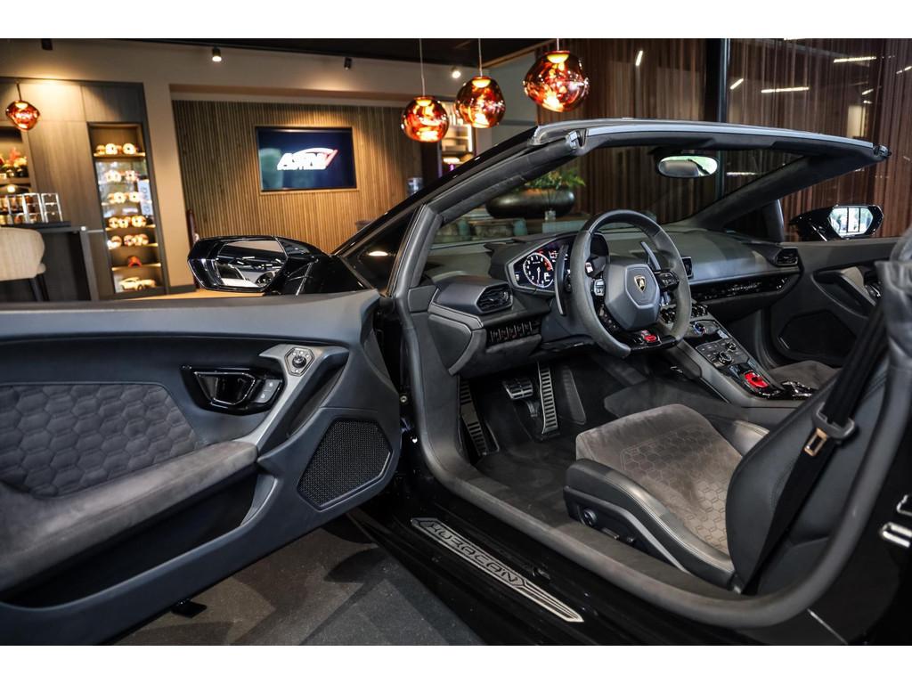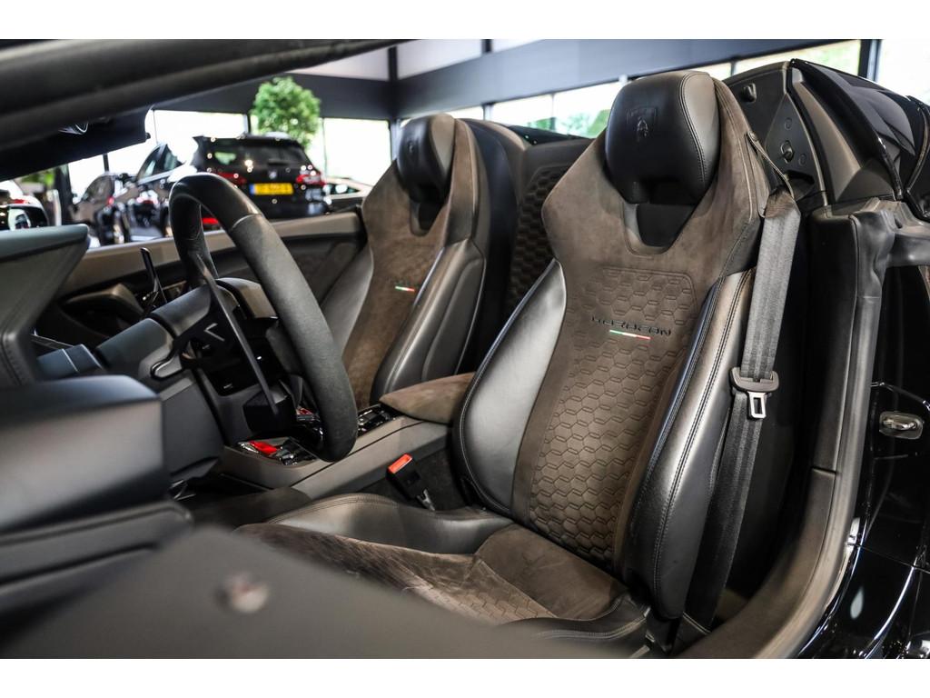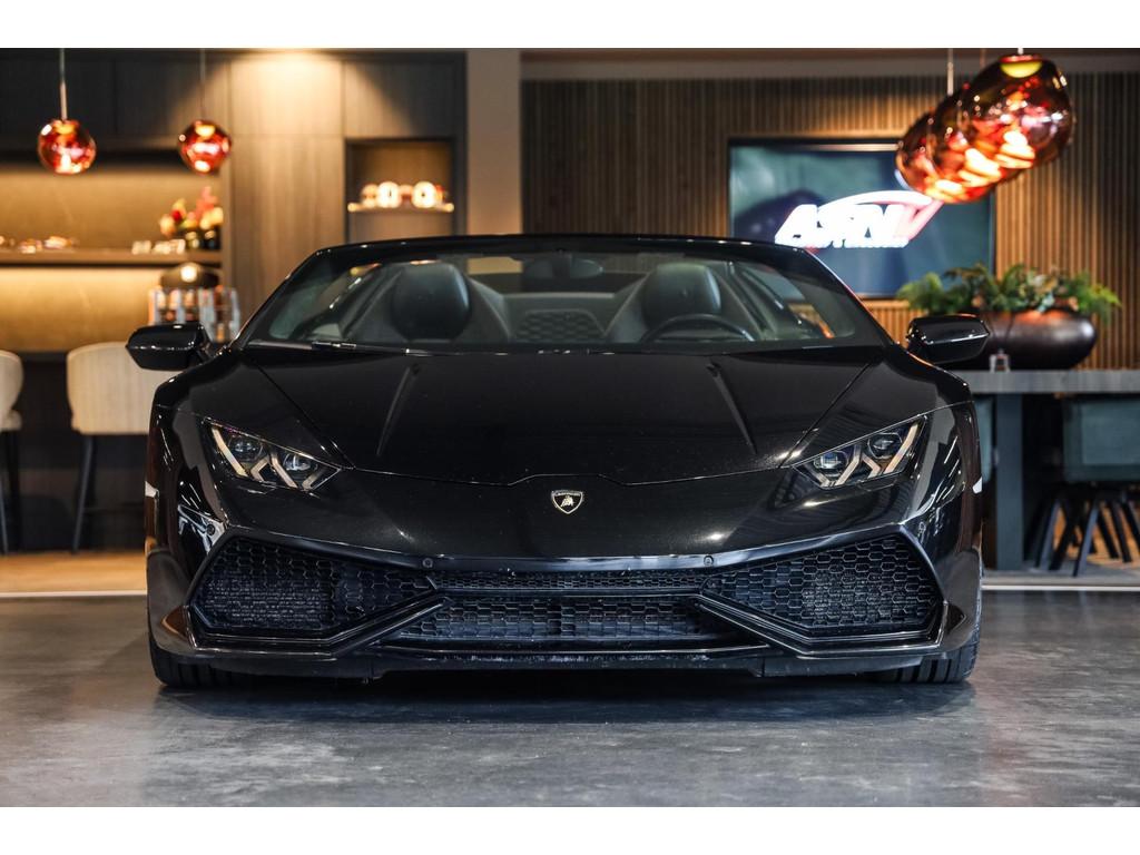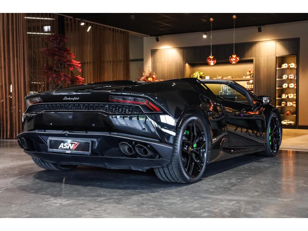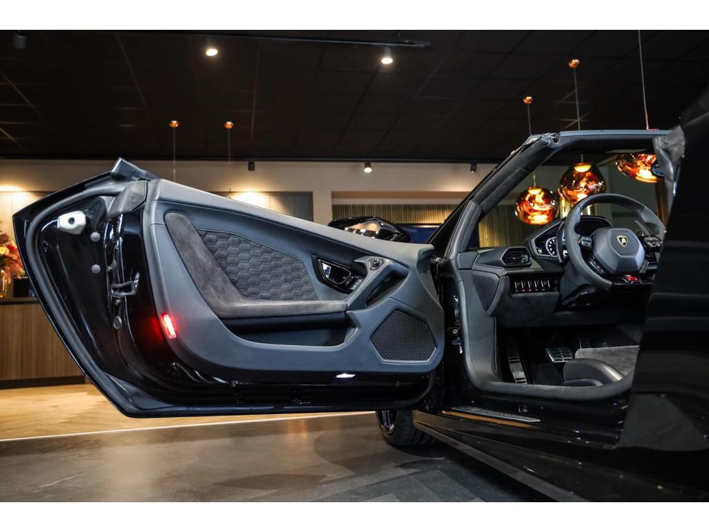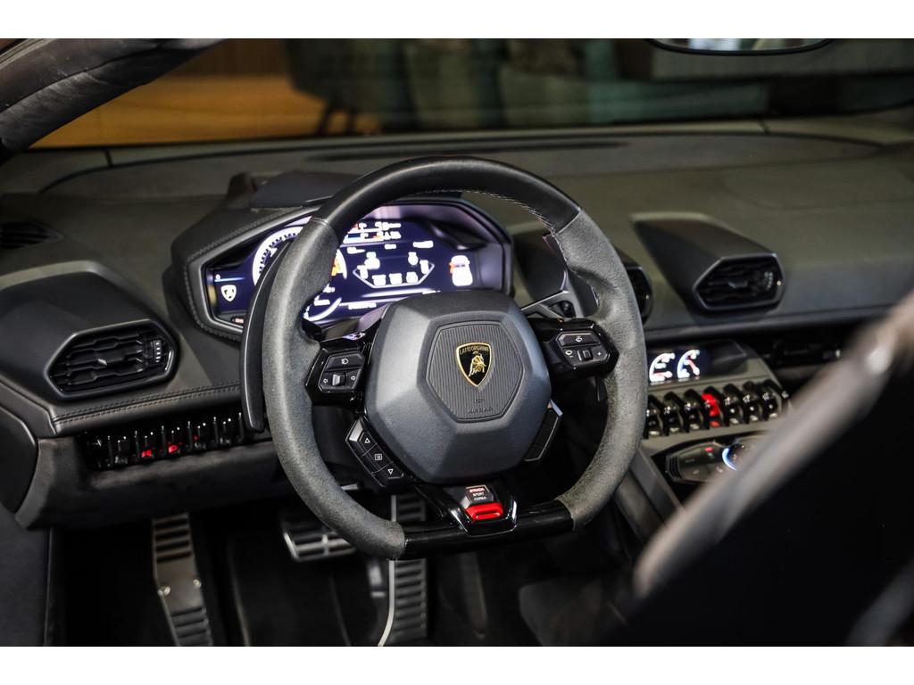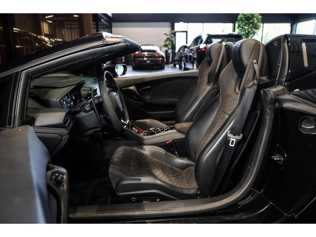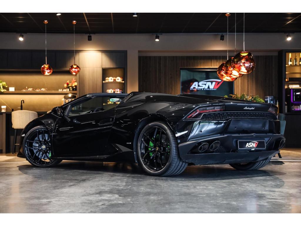"Lichtmetalen velgen 20""", Adaptief Demping Systeem (ADS), Airbag(s) knie, Airbag(s) side voor, Airbag bestuurder, Airbag passagier, Alcantara bekleding, Aluminium sportpedalen en Schakelflippers, Anti Blokkeer Systeem (ABS), Audio installatie premium, Automatische koplampactivering / Lichtsensor, Autotelefoonvoorbereiding met Bluetooth, Bekerhouders, Bestuurdersinformatiesysteem, Comfort middenarmsteun met opbergmogelijkheid, Contrast Stitching, Electronic Stability Program (ESP), Elektrisch bedienbaar zwart gestoffeerde cabrioletkap, Elektrische parkeerrem, Elektrische ramen voor, Elektrische verstelbare stoelen, Elektrisch inklapbare buitenspiegels, Grille, sierlijsten, louvres in hoogglans zwart, I-Pod aansluiting (Aux- en USB), Individual lederen dashboard, Instaplijsten met "Huracan" opschrift, Keramische remschijven, Led achterlichten, Led dagrijverlichting, Led koplampen, Mist achterlicht, Mogelijkheid tot muziek-streaming, Multifunctional Instrument Display, Navigatiesysteem, Nose Lift System, Parkeer pakket, Parkeersensor voor en achter, Remzadels groen 'Verde Mantis' gespoten, Sportuitlaatsysteem incl. ronde sporteindpijpen zwart, Stability en Traction Control, Startblokkering, Stuurbekrachtiging Plus - Snelheidsafhankelijk, Verstelbaar stuurwiel met F1-schakeling, Verwarmde voorstoelen, Vierspaaks multifunctioneel alcantara stuurwiel, Volautomatische comfort airconditioning, Zilveren armaturen verwerkt in het dashboard, Zwart stoffen hemelbekleding, lederen/alcantara bekleding in honinggraad design