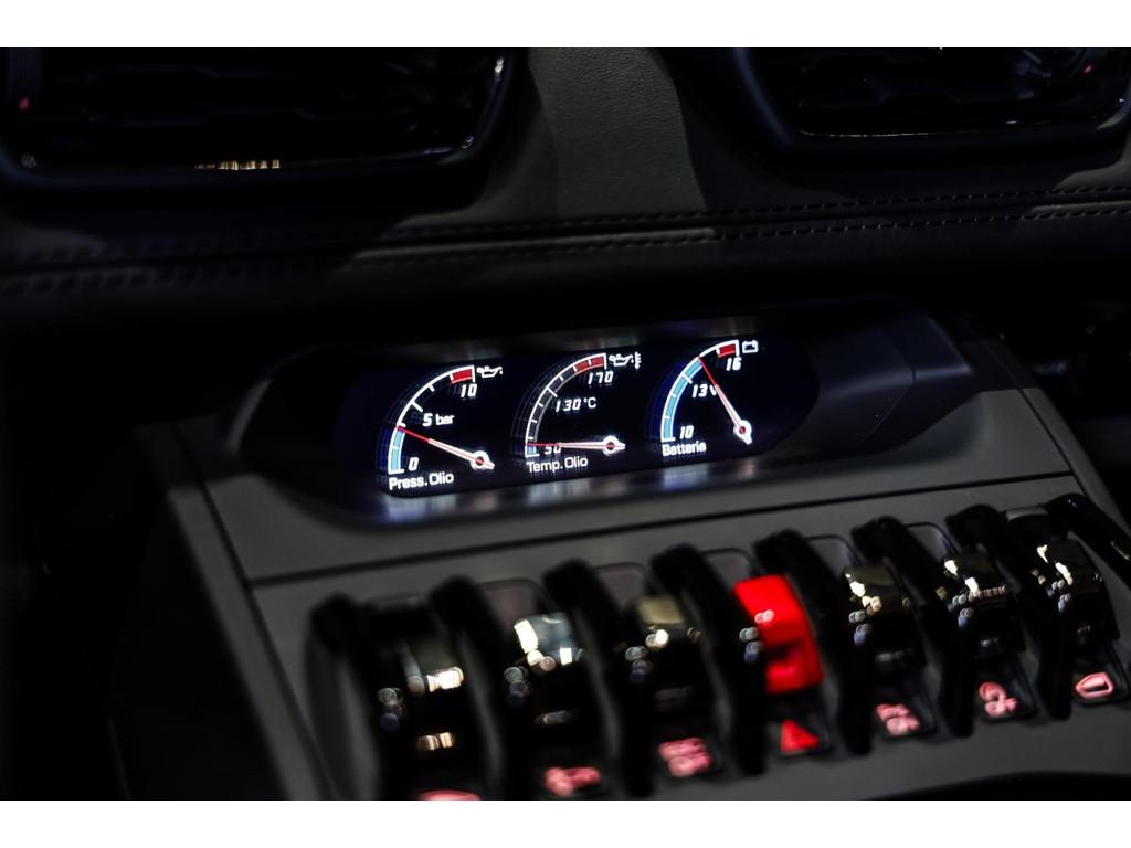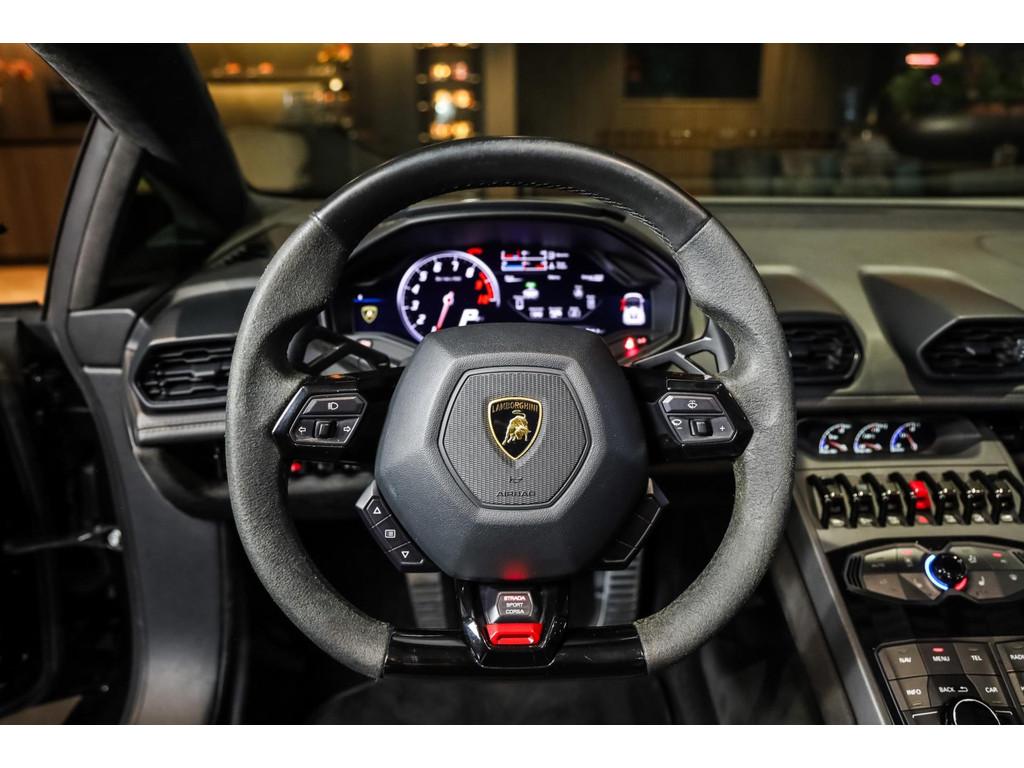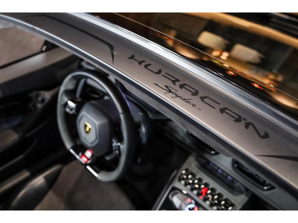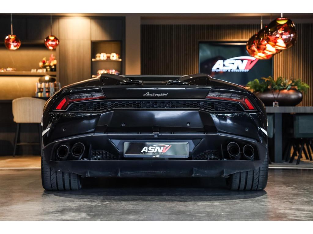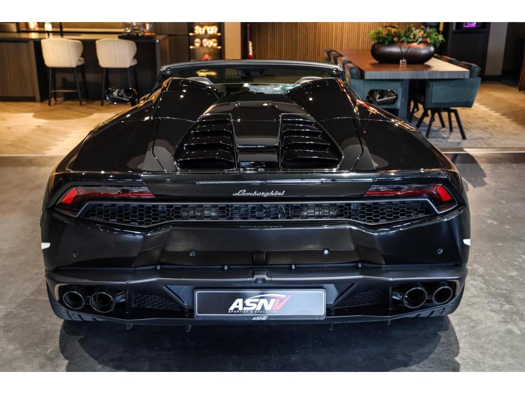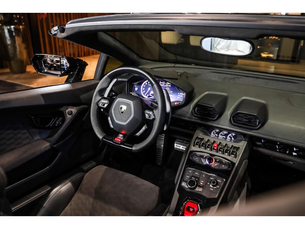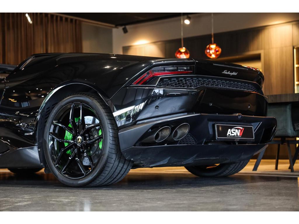 "Lichtmetalen velgen 20""", Adaptief Demping Systeem (ADS), Airbag(s) knie, Airbag(s) side voor, Airbag bestuurder, Airbag passagier, Alcantara bekleding, Aluminium sportpedalen en Schakelflippers, Anti Blokkeer Systeem (ABS), Audio installatie premium, Automatische koplampactivering / Lichtsensor, Autotelefoonvoorbereiding met Bluetooth, Bekerhouders, Bestuurdersinformatiesysteem, Comfort middenarmsteun met opbergmogelijkheid, Contrast Stitching, Electronic Stability Program (ESP), Elektrisch bedienbaar zwart gestoffeerde cabrioletkap, Elektrische parkeerrem, Elektrische ramen voor, Elektrische verstelbare stoelen, Elektrisch inklapbare buitenspiegels, Grille, sierlijsten, louvres in hoogglans zwart, I-Pod aansluiting (Aux- en USB), Individual lederen dashboard, Instaplijsten met "Huracan" opschrift, Keramische remschijven, Led achterlichten, Led dagrijverlichting, Led koplampen, Mist achterlicht, Mogelijkheid tot muziek-streaming, Multifunctional Instrument Display, Navigatiesysteem, Nose Lift System, Parkeer pakket, Parkeersensor voor en achter, Remzadels groen 'Verde Mantis' gespoten, Sportuitlaatsysteem incl. ronde sporteindpijpen zwart, Stability en Traction Control, Startblokkering, Stuurbekrachtiging Plus - Snelheidsafhankelijk, Verstelbaar stuurwiel met F1-schakeling, Verwarmde voorstoelen, Vierspaaks multifunctioneel alcantara stuurwiel, Volautomatische comfort airconditioning, Zilveren armaturen verwerkt in het dashboard, Zwart stoffen hemelbekleding, lederen/alcantara bekleding in honinggraad design